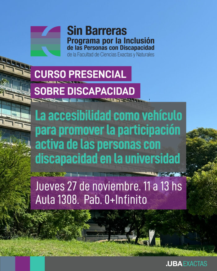 13 de noviembre de 2025Si sos nodocente, trabajás en los equipos de gestión de la FCEN o sos parte de la comunidad de Exactas, te invitamos a la formación La accesibilidad como vehículo para promover la participación activa de las personas con discapacidad en la universidad a cargo de Tec. Johanna Ureña y Lic. Marcelo Betti.